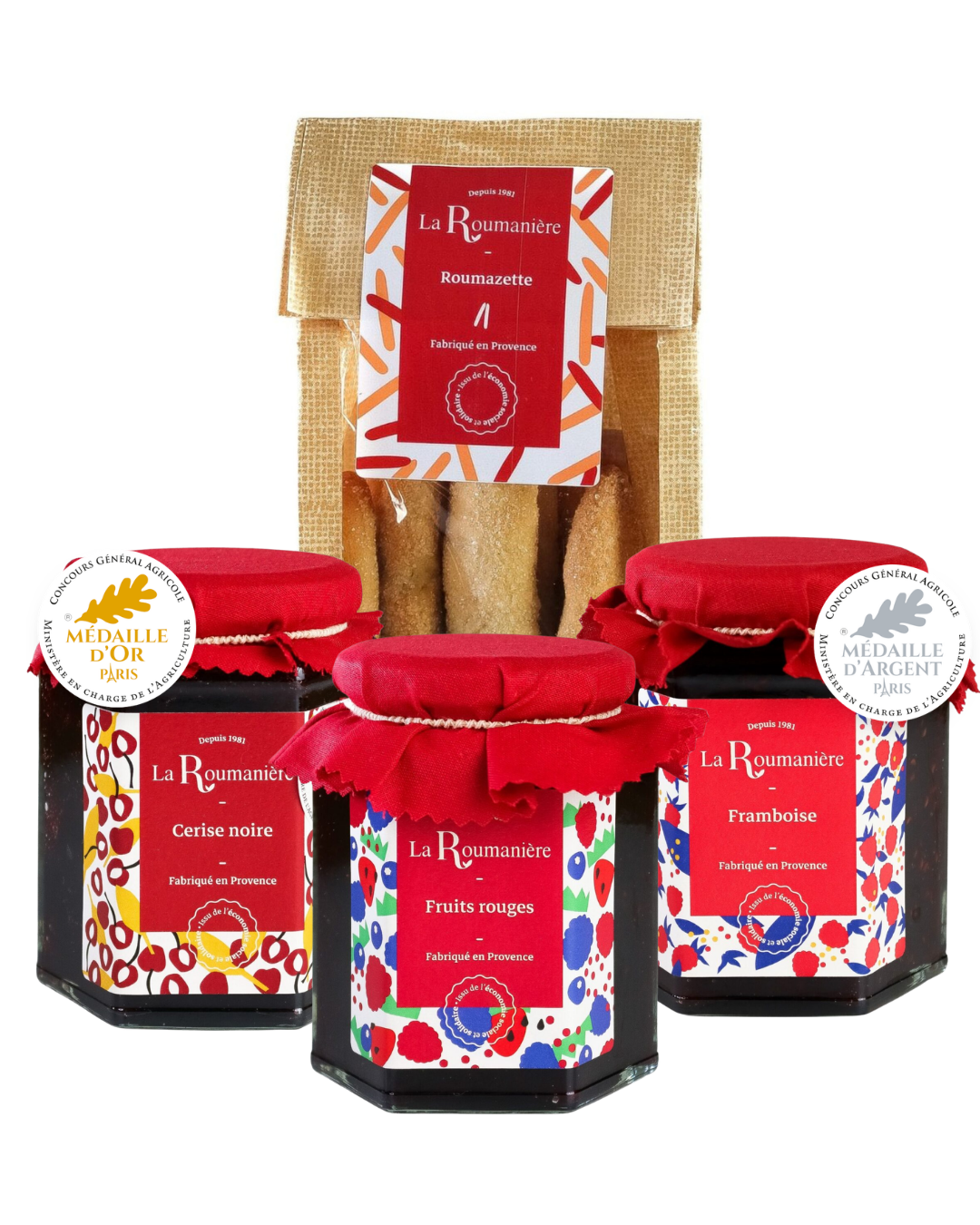 Offrez ou savourez le meilleur de La Roumanière réuni dans un seul coffret. Ce coffret Produits Médaillés rassemble quatre spécialités artisanales fabriquées à Robion, au cœur du Luberon, par nos travailleurs passionnés : deux confitures récompensées en concours, une confiture fruits rouges généreuse et parfumée, et nos incontournables Roumazettes, le biscuit signature de la maison.