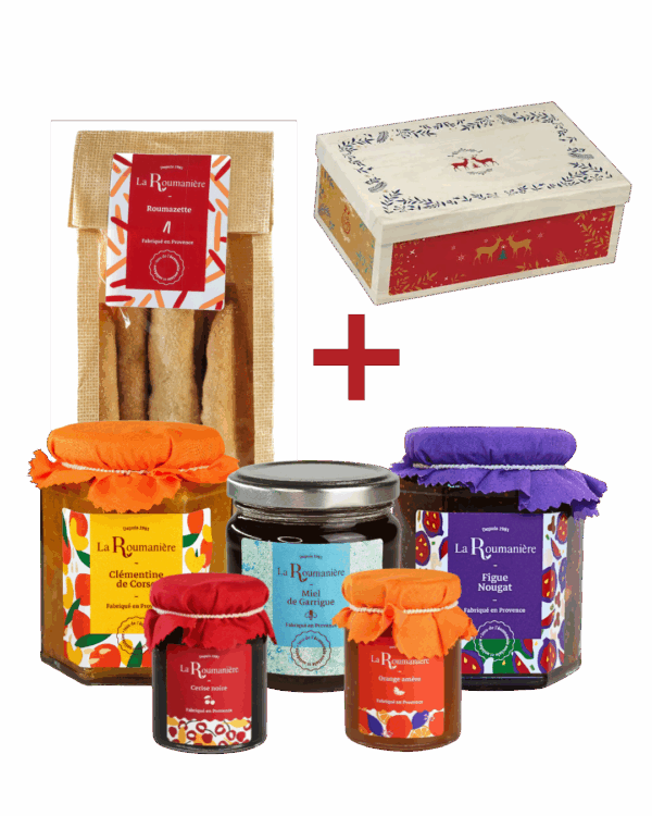 Coffret de Noël La Roumanière : cerise noire, orange amère, figue au nougat, Roumazettes et miel de garrigue. Un cadeau artisanal et gourmand à offrir.